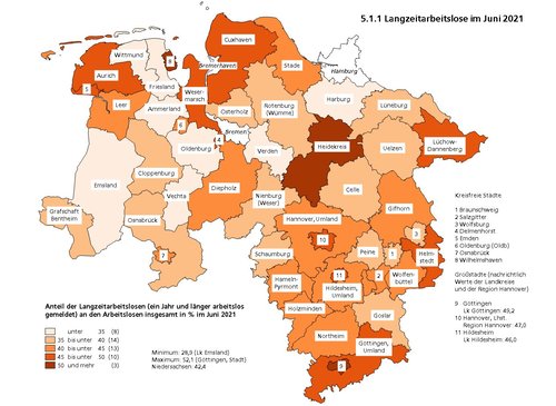 Besonders gestiegen sind die Arbeitslosenquoten vor allem dort, wo sie ohnehin schon vor der Pandemie am höchsten waren. Das betrifft insbesondere die meisten kreisfreien Städte sowie die größeren Städte Hildesheim und Göttingen. Im Westen des Landes in der Statistischen Region Weser-Ems (Juni 2021: 4,8%) fielen hingegen in 10 von 12 Landkreisen die Quoten unterdurchschnittlich aus. Die Statistischen Regionen Hannover und Braunschweig hatten Quoten von 6,7% und 5,6%. In der ländlich geprägten Statistischen Region Lüneburg betrug die Quote 5,0%.