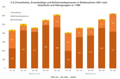 In Niedersachsen waren 2021 insgesamt 137.000 Frauen und Männer erwerbslos und damit lediglich rund 9.000 mehr als 2019 (bei eingeschränkter Vergleichbarkeit). Bei der Zahl der Arbeitslosen war der Unterschied größer, was darauf hindeutet, dass viele der hinzugekommenen Arbeitslosen nicht gänzlich erwerbslos waren, sondern oftmals Jobs hatten, jedoch im geringeren Umfang von weniger als 15 Stunden in der Woche. Die Erwerbslosenquote, das heißt, der Anteil der Bevölkerung im Erwerbsalter (hier 15 bis unter 65 Jahre), der keiner entgeltlichen Beschäftigung von mindestens einer Stunde pro Woche nachging, lag bei 3,4%. Die Erwerbslosenquote der Männer übertraf mit einem Wert von 3,8% die der Frauen mit 2,9%.
