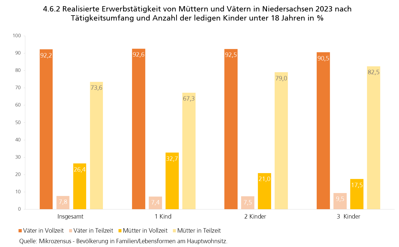 Im Vergleich zu den Müttern wiesen die Väter 2023 mit einer Erwerbstätigenquote von 92,1% weiterhin eine deutlich höhere Erwerbsbeteiligung auf. Die realisierte Erwerbstätigkeit lag mit 91,3% fast gleichauf. (Zur Erwerbstätigkeit von Müttern und Vätern im Familienkontext siehe Lehmann, Arne: Erwerbstätigkeit von Müttern und Vätern in Niedersachsen 2018, in: Statistische Monatshefte Niedersachsen (Landesamt für Statistik Niedersachsen) 6/2020, S. 256-267.) Selbst bei mindestens drei Kindern, wo bei Müttern ein deutlicher Rückgang der realisierten Erwerbstätigkeit zu beobachten ist, lag die Quote unter den Vätern mit 86,9% nur wenig vom Durchschnitt entfernt. Die Teilzeitquote betrug nur 7,8%, bei drei und mehr Kindern waren es 9,5%.